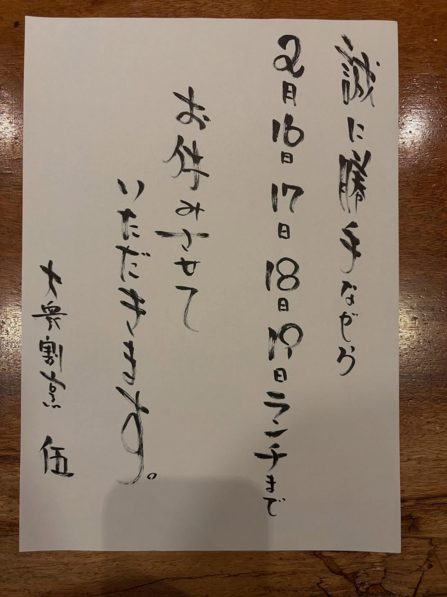 お知らせ 16日月曜日から19日のお昼まで お休みさせていた… 2026年2月14日大衆割烹 伍locals お知らせ 16日月曜日から19日のお昼まで お休みさせていただきます。 19日の夜から営業となります。 よろしくお願いします。 #籠原ランチ #深谷ランチ #居酒屋 #籠原ディナー #籠原顔合わせ 籠原レストラン伍熊谷ディナー大衆割烹 籠原てんぷら籠原お刺身熊谷七五三深谷七五三熊谷お食い初め熊谷顔合わせ深谷顔合わせ